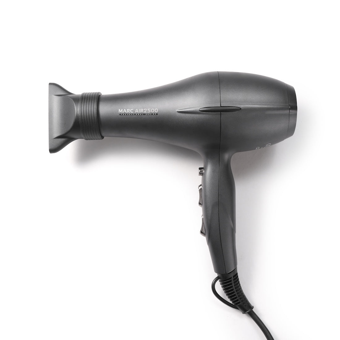 Marc Air 2500 Hair Dryer is a powerful and versatile styling tool designed for efficient and comfortable use. With its long-life AC motor operating at 240V, it offers two speed and two heat settings, allowing you to customize the airflow and temperature to suit your hair type and styling needs. The cool shot feature helps set your style in place, while the interchangeable silicone nozzles ensure even distribution of air for a smooth, frizz-free finish. The lightweight body reduces arm fatigue during use, and the auto overheating protection system ensures safe operation. This hair dryer is an excellent choice for achieving salon-quality results at home.