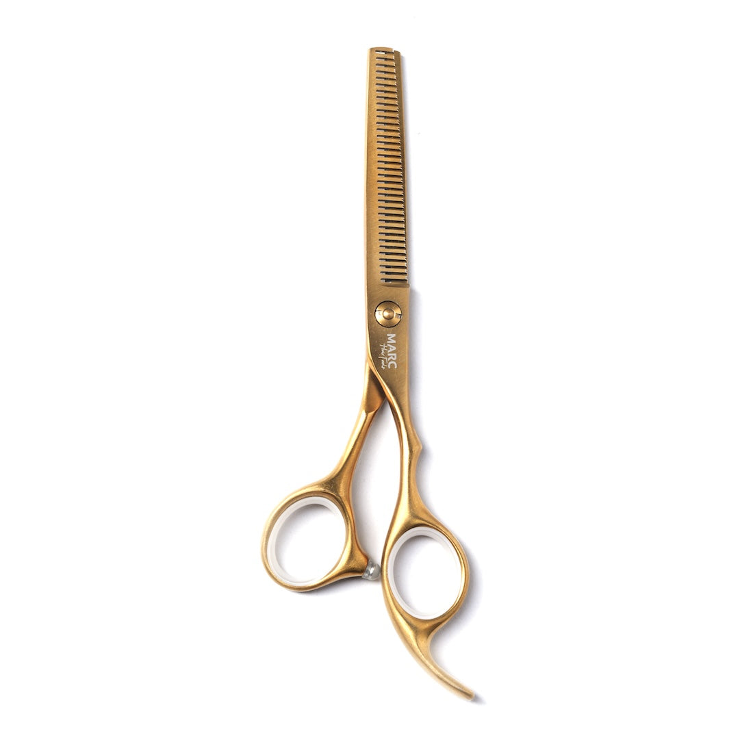 Elevate your hairstyling prowess with the Marc ST-6 professional hair-cutting scissors. These golden-coloured scissors are crafted from premium stainless steel, ensuring exceptional durability and resistance to rust and corrosion. The razor-sharp blades deliver precise, clean cuts that meet the exacting standards of professional stylists. With optimal weight distribution and balance, these scissors offer superior control and stability during intricate cutting techniques. The ergonomic design reduces hand fatigue during long styling sessions, whilst the professional-grade construction guarantees reliable performance day after day. Whether you're executing detailed texturing or basic trimming, these scissors provide the precision and comfort needed for creating flawless hairstyles.